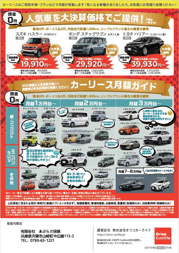 あぶらだ保険では≪株式会社オリコカーライフ≫のカーリースを取り扱っております。